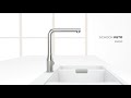 Высокий излив поворачивается на 180°. Выдвижной излив с тихим аэратором обеспечивает дополнительный комфорт при работе. Легкое подключение гибкими шлангами длиной 450 мм с гайкой 3/8”. Отверстие для монтажа ø35 мм.